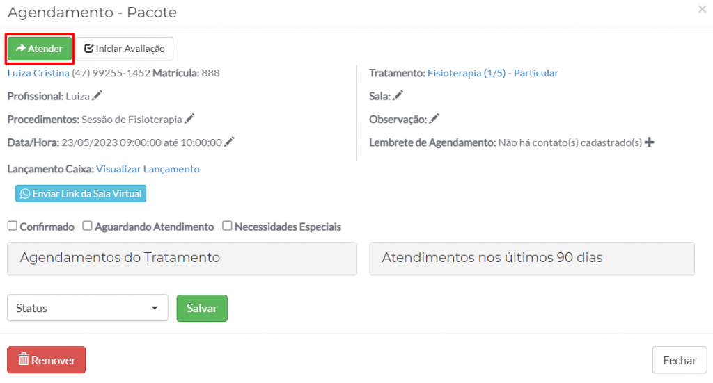 Ao clicar em cima do agendamento, o sistema abrirá a tela com as informações do tratamento do paciente. Para ir para o atendimento, o profissional deverá clicar em Atender: