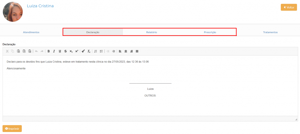 Clicando em prontuário o sistema irá abrir um nova aba com os campos de declaração, relatório, prescrição onde é possível editar a caixa de texto e imprimir.