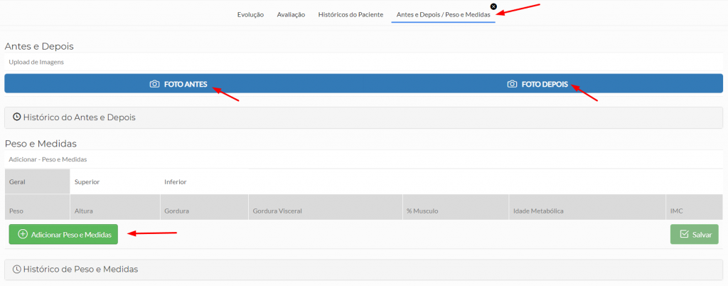 Caso seu nível de permissão tenha esse recurso de Ates e Depois/Peso e Medidas, é possível inserir foto para comparação de evolução do paciente e também seu peso e medidas.