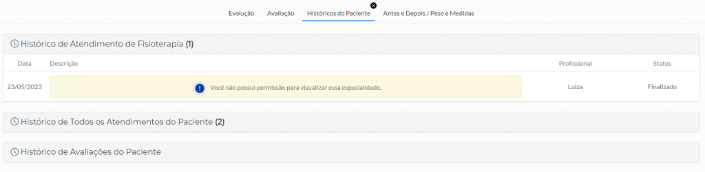 Caso apareça uma notificação informando que o profissional não possui permissão para visualizar o histórico do Paciente, significa que ele não possui a autorização para visualizar a especialidade.